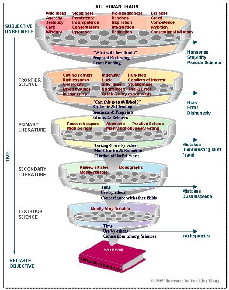 This knowledge filter illustrates that it’s peer review, and the awareness of peer review, and the passage of time that makes scientific knowledge non-subjective and reliable. But there’s nothing automatic about peer review or self-discipline. If peer review is cronyism – if scientists believe it proper to praise their friends and relatives rather than meritorious work irrespective of who does it – then false views and unreliable results will be disseminated.