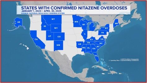NewsNation published an article on September 12, 2025, warning the DEA found fake oxycodone pills laced with nitazene during a drug bust on New York’s Long Island in August of 2025. A retired FBI agent thought the nitazenes rage would be just like fentanyl—meaning it’s much more potent and less expensive. “So this is the perfect combination for drug dealers to sell to addicts because they’re looking for a greater high at a cheaper price.” Known as the “Frankenstein drug,” nitazene overdoses have been reported in 25 different states. See the following map, of confirmed nitazene overdoses between January 2023 and April 2025 found in the NewsNation article: