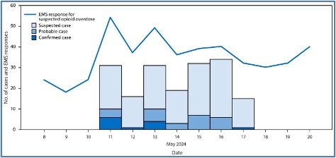 The CDC’s May 2025 MMWR (Morbidity and Mortality Weekly Report) described an increase in emergency medical service responses for suspected opioid-involved overdoses with atypical symptoms, mostly clustered on Chicago’s West Side. There were 12 confirmed, 26 probable, and 140 suspected overdoses involving medetomidine mixed with opioids among patients treated at three hospitals in Chicago’s West Side during May 11-17 2024. This was the first time medetomidine was identified in Chicago’s illegal drug supply. Fentanyl was identified in all the drug samples and blood specimens that had medetomidine. See the chart below from the May 2025 MMWR.