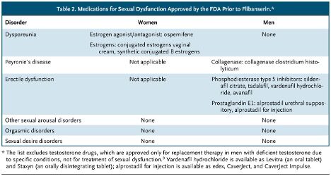 This rejection prompted allegations of gender bias at the FDA, based on erroneous claims that it had approved more than 20 drugs for male sexual dysfunction and none for women. (Those making such assertions included Even the Score, an advocacy campaign partly funded by Sprout Pharmaceuticals, flibanserin’s sponsor after Boehringer Ingelheim sold the rights to the drug.) The FDA rejected these claims and clarified what products had been approved. [see the following table from the article]